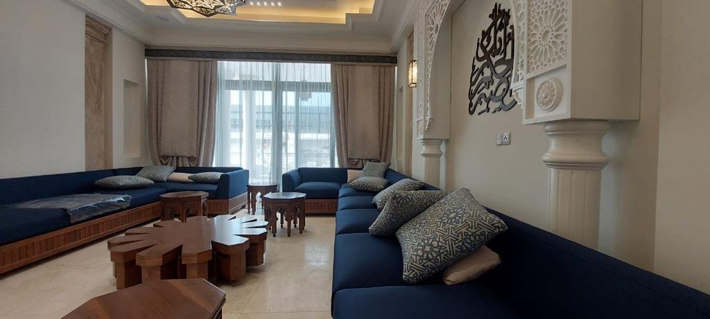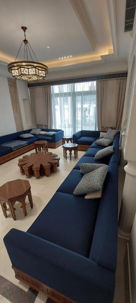 The project also included Islamic lighting and fabrics with embroidery details to match the required theme. This project was especially enjoyable, as it allowed us to reflect the beauty of Arab-Islamic art in décor, furniture, and lighting.