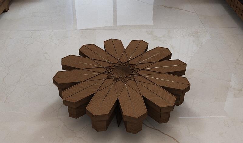 The majlis was designed in Islamic style with wooden décor, columns, and Arabic-Islamic calligraphy, which was executed using CNC technology. The majlis also featured service and center tables, with a special touch in cutting the veneer into strips to match the design, creating a radiating texture carefully and precisely implemented.