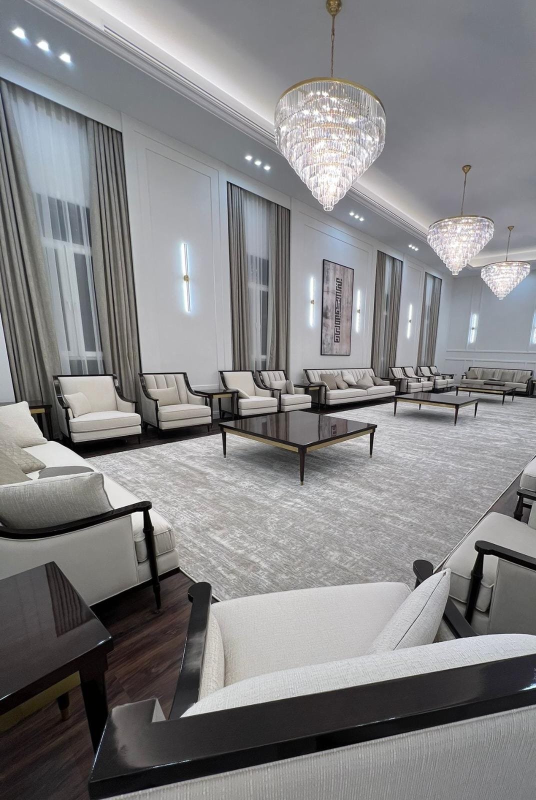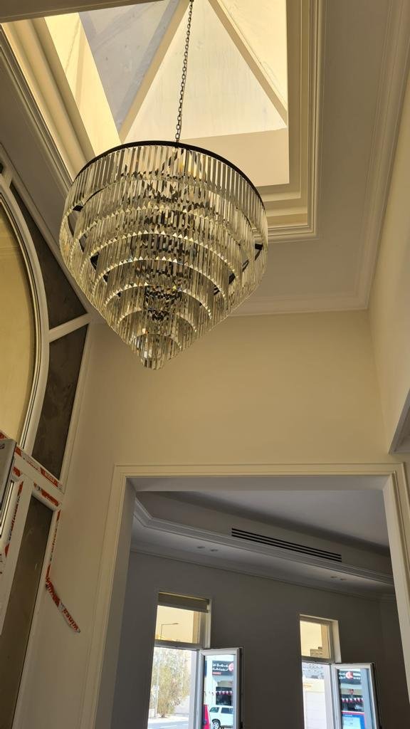 Yer: Doha, Katar. Proje, müşterinin iş birliği yaptığımız bir firmadan mobilya satın almasının ardından başladı. Daha sonra bizden, majlis ve girişin aydınlatmasını; avizeler ve duvar aydınlatmaları dâhil olmak üzere uygulamamızı istedi. Avize, birinci sınıf kristal ve metal kullanılarak üretildi.